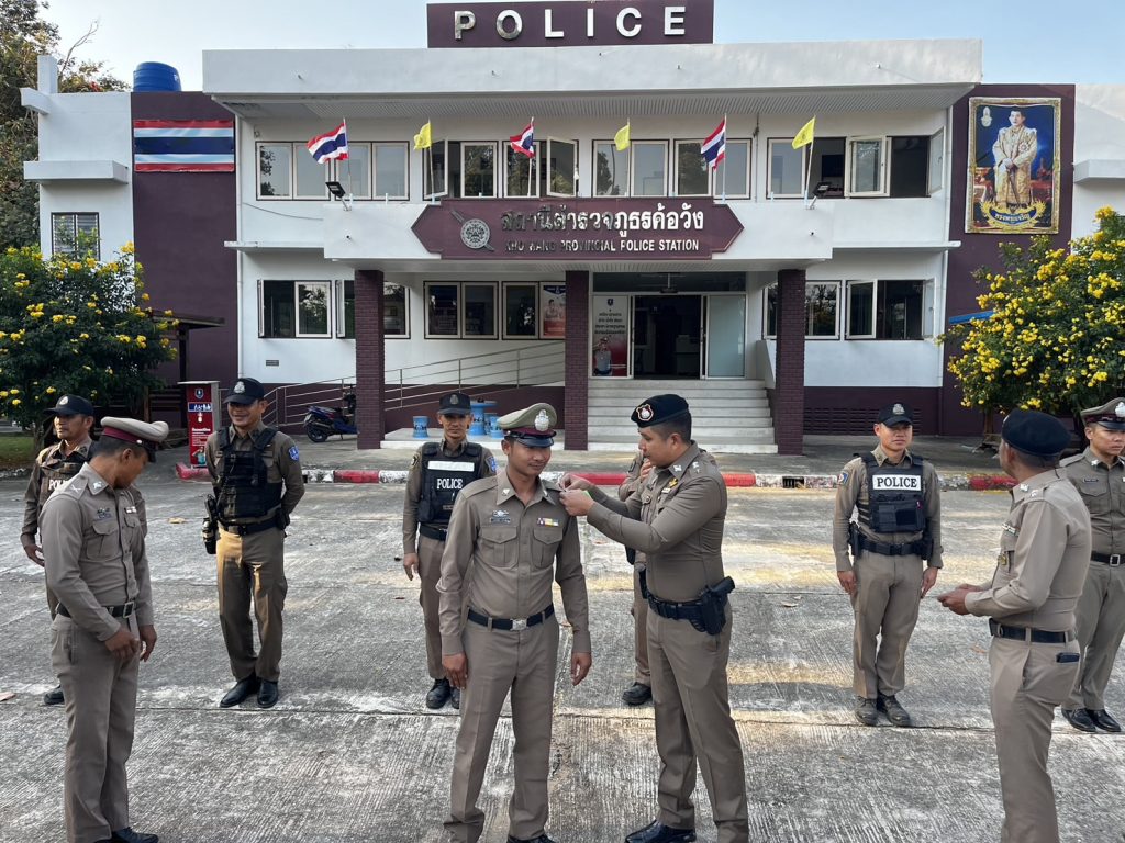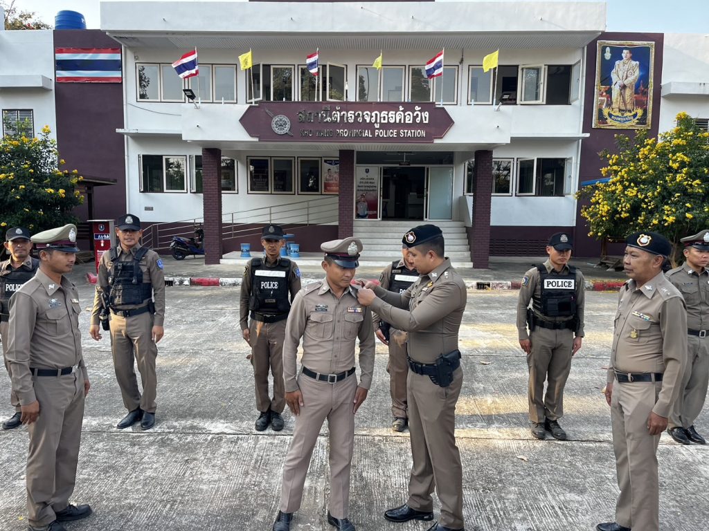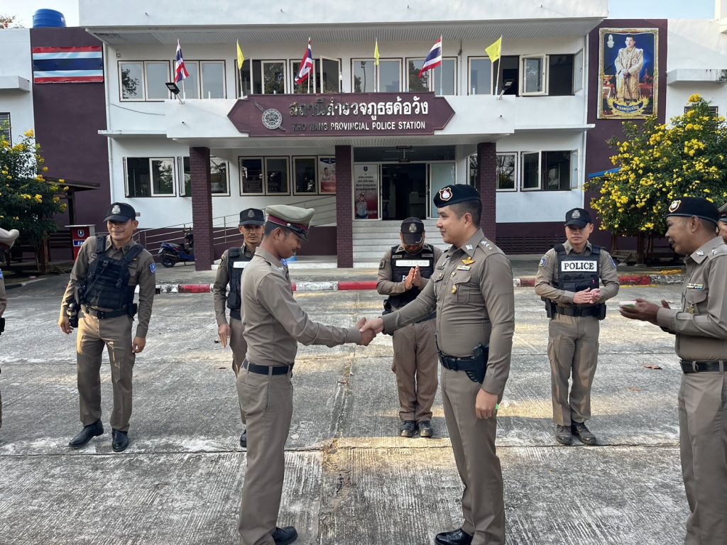 วันที่ 4 ก.พ.2568 เวลา 08.09 น. พ.ต.อ.สาโรจน์ เพ็ญสูตร์ ผกก.สภ.ค้อวัง พ.ต.ท.ศักดิ์สมบูรณ์ ขุนพรหม สวป.ฯ ประดับยศและแสดงความยินดีกับข้าราชการตำรวจในสังกัดในโอกาสเลื่อนยศสูงขึ้นจาก จ.ส.ต. เป็น ด.ต. จำนวน 2 นาย ดังนี้ 1.ด.ต.กฤตนัย แก้วคำ ผบ.หมู่(ส.)สภ.ค้อวัง 2.ด.ต.ปัณณวัฒน์ ยางงาม ผบ.หมู่(ป.)สภ.ค้อวัง