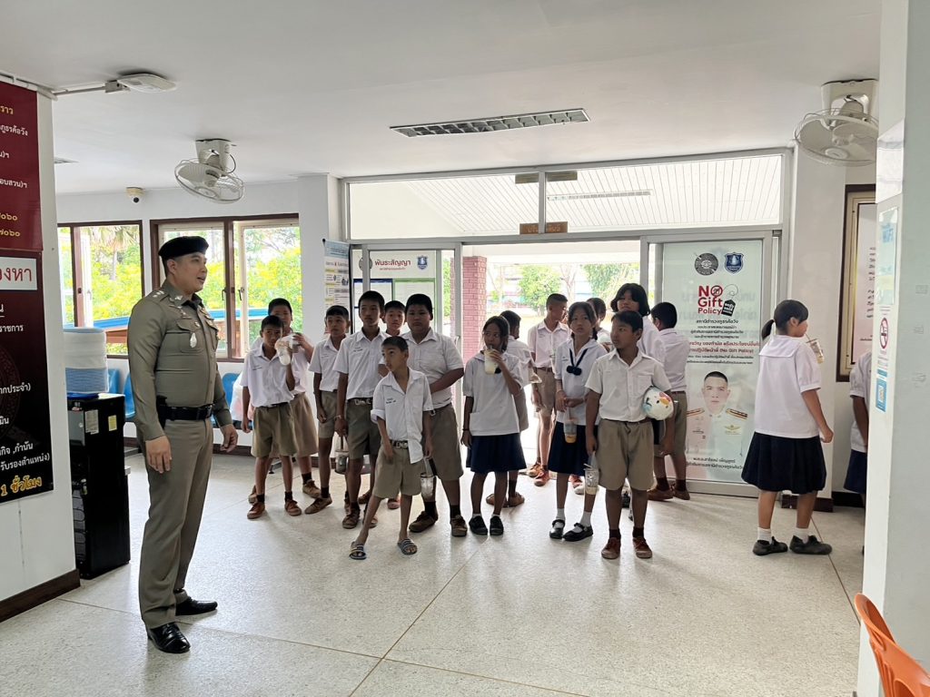 วันที่ 7 มี.ค.2568 เวลา 14.00 น. พ.ต.อ.สาโรจน์ เพ็ญสูตร์ ผกก.สภ.ค้อวัง ร.ต.ท.นพปฎล บุญเต็ม รอง สว.(ป.)ฯ ปฏิบัติหน้าที่ครูตำรวจ D.A.R.E. ตามโครงการการศึกษาเพื่อต่อต้านการใช้ยาเสพติดในเด็กนักเรียน (D.A.R.E. ประเทศไทย) ภาคเรียนที่ 2/2567 โรงเรียนกุดน้ำใสจานบกน้อย ต.กุดน้ำใส อ.ค้อวัง จ.ยโสธร ระดับ ป.5 ในชั่วโมงกิจกรรมพิเศษ นำเยี่ยมชมที่ทำการ สภ.ค้อวัง ให้ความรู้เกี่ยวกับการป้องกันการล่วงละเมิดทางเพศต่อเด็กในโลกออนไลน์ (TICAC) การใช้รถใช้ถนนตามกฎหมายจราจรทางบกและโทษภัยของบุหรี่ไฟฟ้าและยาเสพติด ได้รับความร่วมมือจากทางคณะครูและนักเรียนเป็นอย่างดี