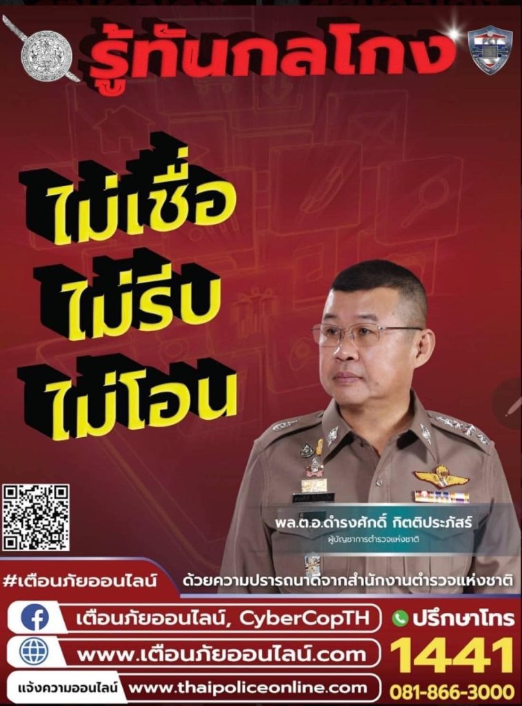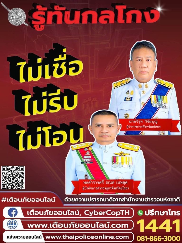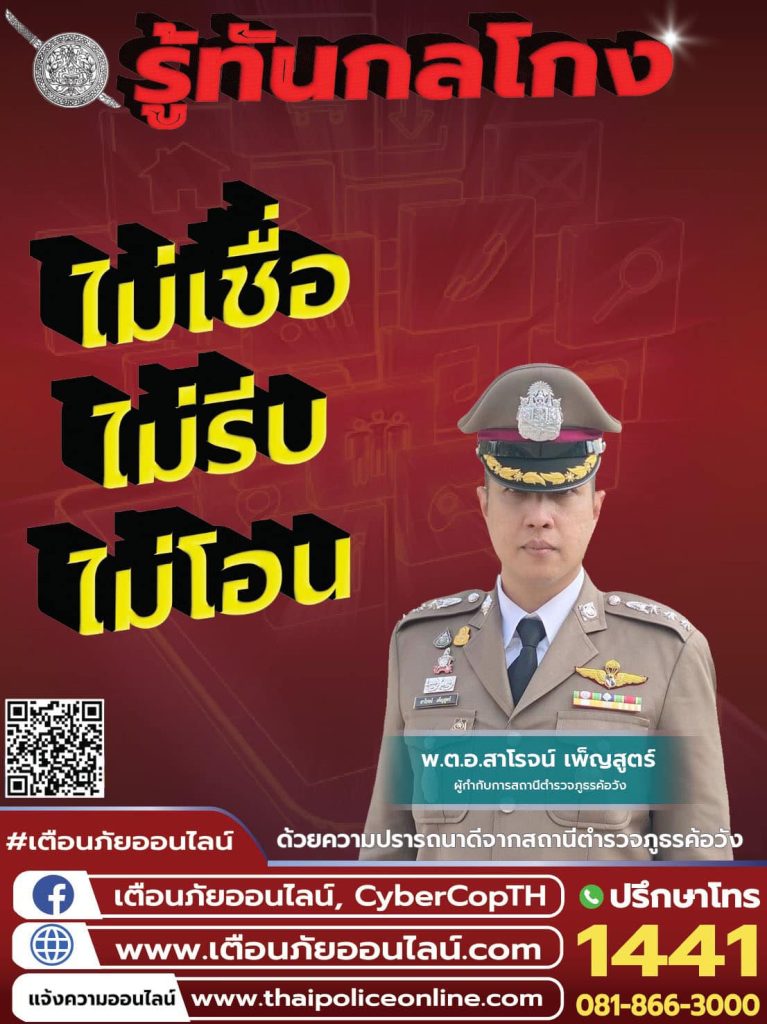 5 ก.ค.66 เวลา 09.30 น. พ.ต.อ.สาโรจน์ เพ็ญสูตร์ ผกก.สภ.ค้อวัง พ.ต.ท.เจริญชัย วะดี รอง ผกก.ป.ฯ พ.ต.ท.พลพิไชย พันธ์อินทร์ รอง ผกก.สส.ฯ พ.ต.ท.ยงยุทธ ภูสมนึก รอง ผกก.(สอบสวน)ฯ พ.ต.ท.ณรงค์ คำบุญ สว.อก.ฯ และคณะ กต.ตร.สภ.ค้อวัง ร่วมประชุมทางไกลผ่านจอภาพ(Video conference) พิธีเปิดการรณรงค์ “ผนึกกำลังร่วมใจ ต้านภัยไซเบอร์ ไม่เชื่อ ไม่รีบ ไม่โอน รู้ทันกลโกง” โดยมี พล.ต.อ.ดำรงศักดิ์ กิตติประภัสร์ ผบ.ตร. เป็นประธานฯ พร้อมมอบโปสเตอร์การรณรงค์ต้านภัยไซเบอร์ให้กับ คณะ กต.ตร.สภ.ค้อวัง เพื่อนำไปประชาสัมพันธ์ให้ประชาชนในพื้นที่รู้เท่าทันภัยอาชญากรรมทางเทคโนโลยี ณ ห้องประชุม สภ.ค้อวัง